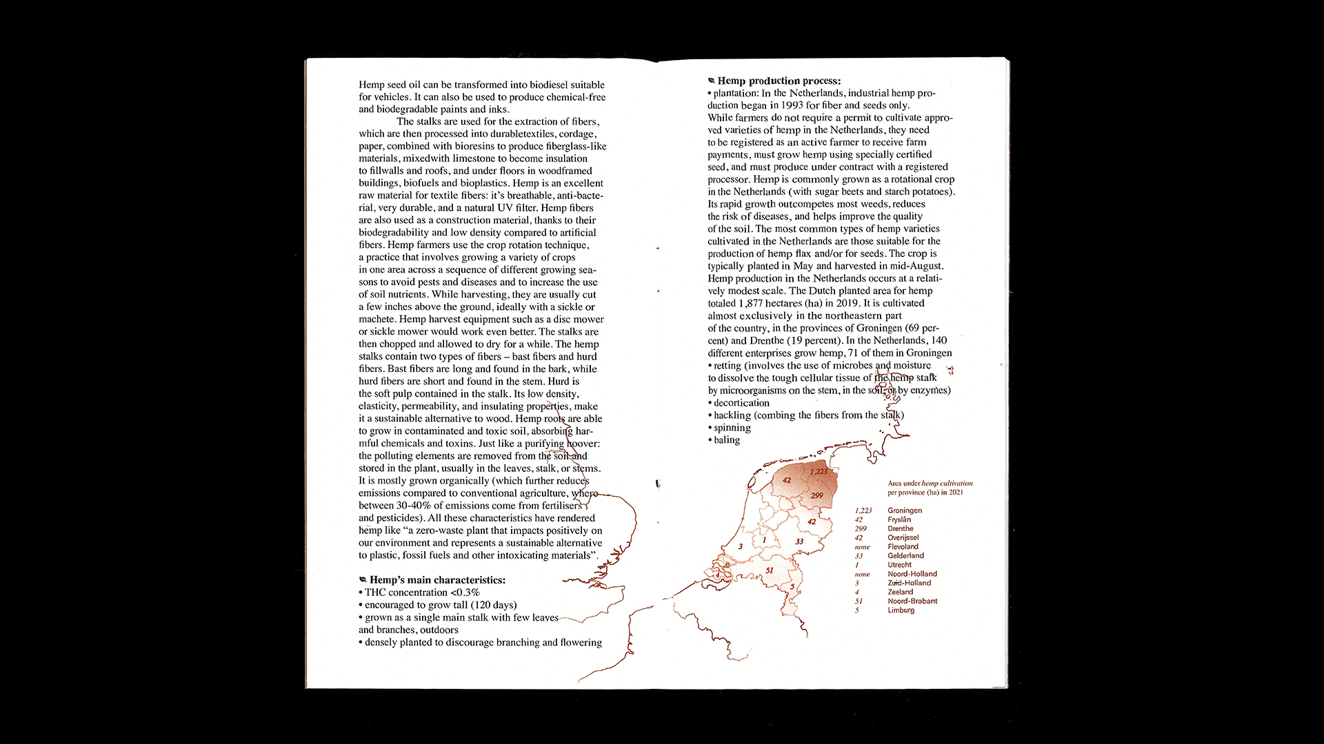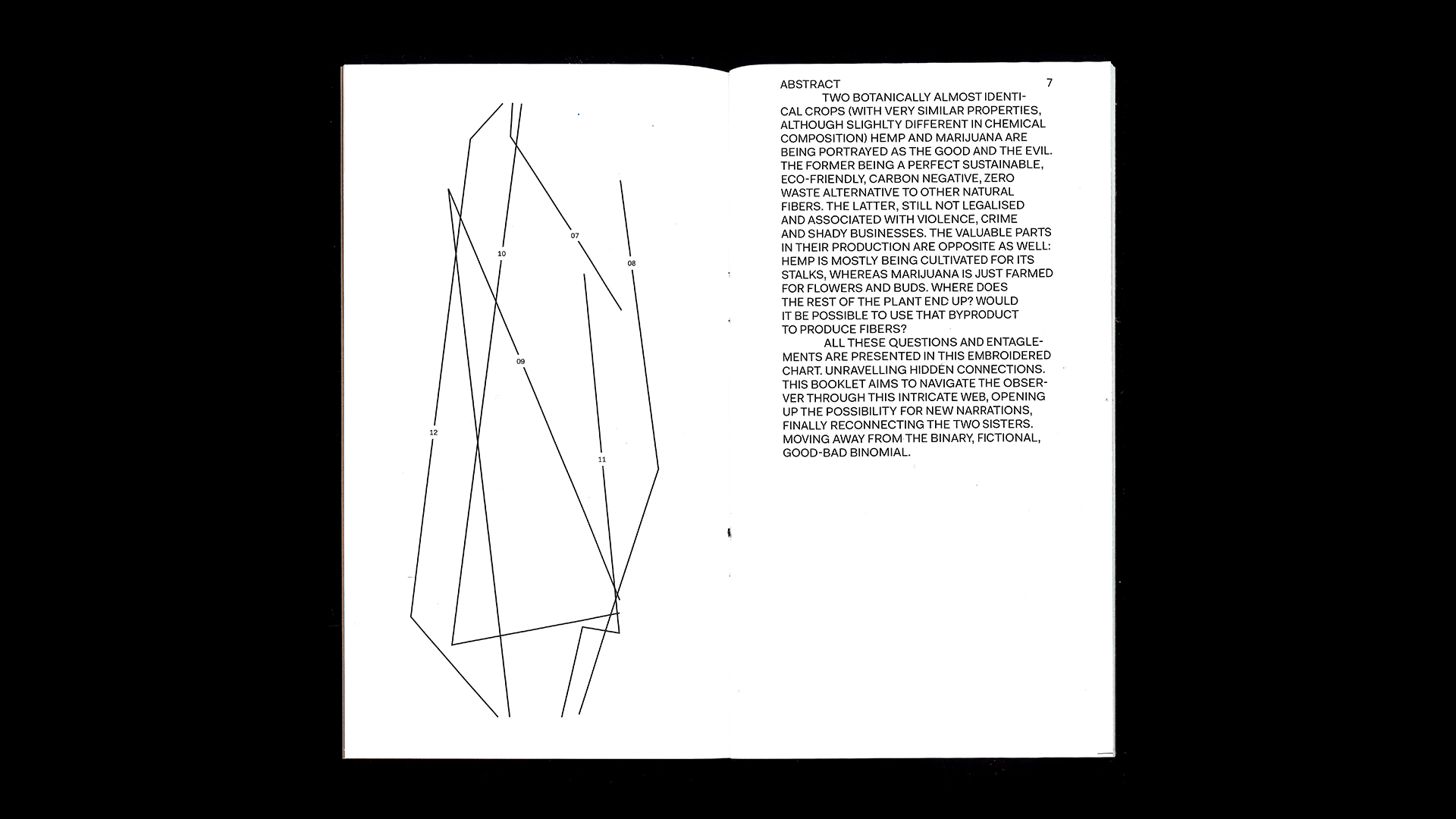 Two crops almost identical botanically (with very similar properties although slightly different in chemical composition), hemp and marijuana are being portrayed as the good and the evil. The former being a perfect sustainable, eco-friendly, carbon negative, zero waste alternative to synthetic fibers. The latter, still mostly not legalised and associated with addiction, crime, and shady business. The valuable extracted parts in the manufacturing of the two are opposite as well: hemp is mostly cultivated for its stalks, whereas marijuana is just farmed for flowers and buds. Where does the rest of the plant end up? Would it be possible to use its byproduct to produce textile fibers? Is the possibility being even discussed? In an attempt to move away from the binary connotations characterising the two crops, this research tries to tie them back together, showing their socio-political, biological entaglements. A series of conversations with weed and hemp producers in the Netherlands guided this reconnection.
